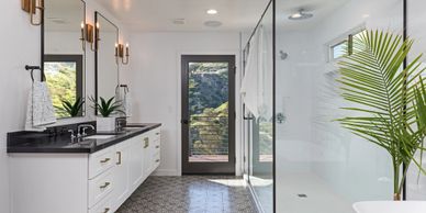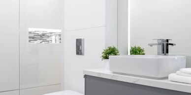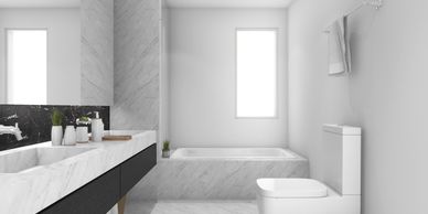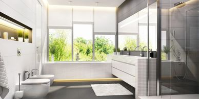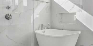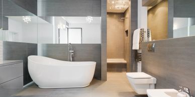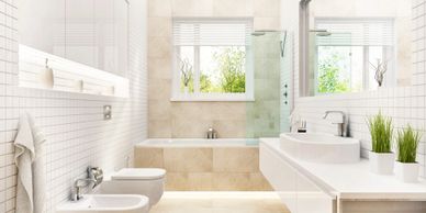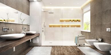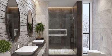 Full bathroom remodel consist of a full tear down of existing bathroom, drywall installation, waterproofing, paint, wall and floor tile, installation of fixtures, toilet, vanity, and bathroom accessories.